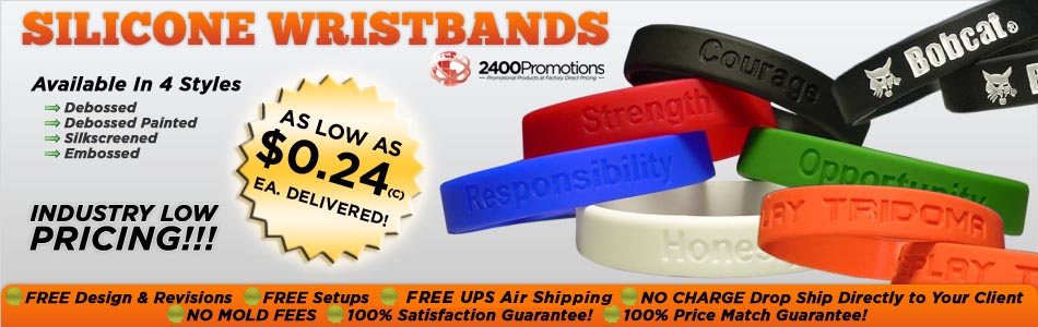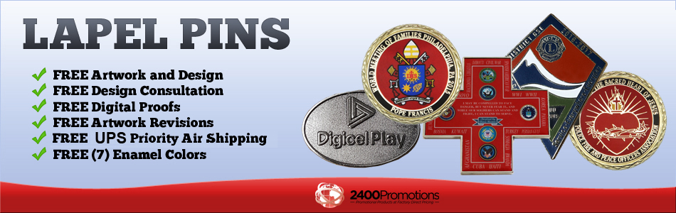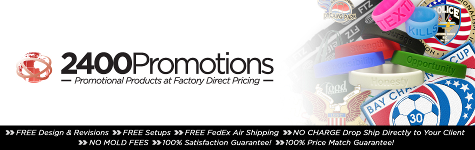 Welcome to 2400 Promotions. An industry leader for over 20 years, we specialize in the manufacture and worldwide shipment of specific promotional items to our clientele. We manufacture Custom Lapel Pins, Custom Trading Pins, Custom Challenge Coins, Medals, Award and Recognition Pins, Custom Silicone Wristbands, Custom Silicone Key Chains, Silicone USB Drive Holders, Vinyl Wristbands and Bracelets, Custom Neck Lanyards, Custom Embroidered Patches, Custom Embroidered Labels and Emblems and Custom Non-Woven Bags.