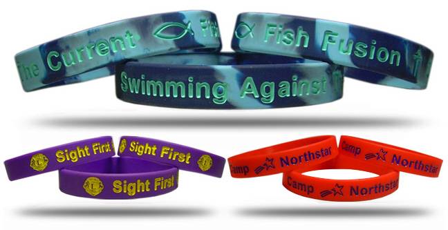 Debossed Printed wristbands are produced by creation of a mold that resembles the shape of the wristband. The mold has inclusions in it that represent the text or images that will be recessed into the wristband surface. The mold is created from artwork generated by staff members here at 2400Promotions.com., from your design ideas and requests. We have thousands of images and hundreds of font styles at our disposal to help you with creation of your original custom silicone bracelet design. The artwork that you approve will be used to create your mold. Once the mold is created, molten silicone in the color of your choice, whether a single color, segmented colors, swirled color combinations or "glow in the dark" color is poured into the mold and allowed to cure. Once cured, the wristband is removed from the mold and the recessed text, logos and images are filled with environmentally safe, LEAD FREE paint that is guaranteed to last. Once the Painting process is complete your custom Debossed Printed wristbands are packaged for delivery.