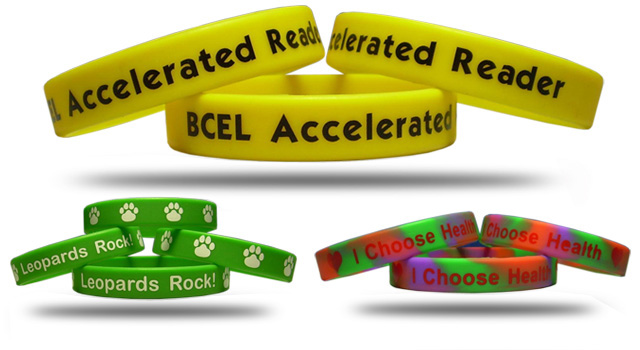 Silkscreen wristbands are produced by creation of a mold that resembles the shape of the wristband. One the mold is created, molten silicone in the color of your choice, whether a single color, segmented colors, swirled color combinations or "glow in the dark" color is poured into the mold and allowed to cure. Once cured, the wristband is removed from the mold, your text, logos and images are printed with environmentally safe, LEAD FREE paint that is guaranteed last. Once the Printing process is complete your custom Silkscreen wristbands are packaged for delivery